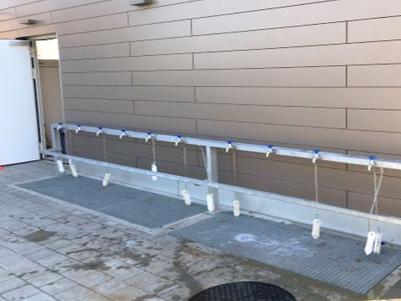 Im Aussenbereich wurden eine Schuhwaschanlage, sowie die Sportfeld-Bewässerung angeschlossen. Das Clubhaus des örtlichen Fussballvereins ist auch am Garderobengebäude bezüglich der Kalt- und Warmwasserversorgung angeschlossen.